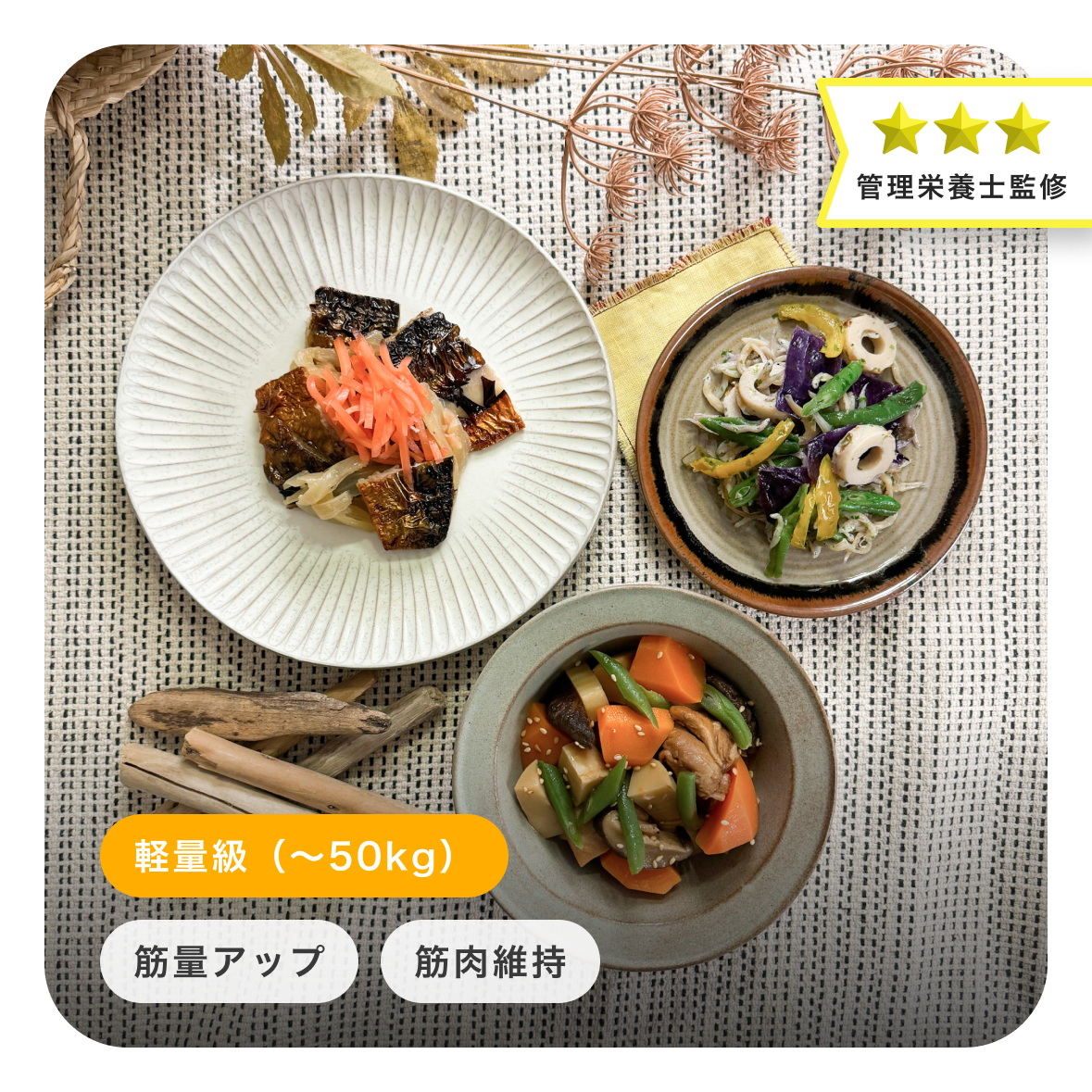 主菜×1、副菜×2で1食あたりたんぱく質40gが摂取できる内容となっております。軽量級(50kg未満)で筋肉量アップが目的のアスリート、中量級(50kg以上70kg未満)の筋肉量とコンディションの維持が目的のアスリート、中量級(50kg以上70kg未満)の筋肉量アップが目的の一般の方におすすめです。