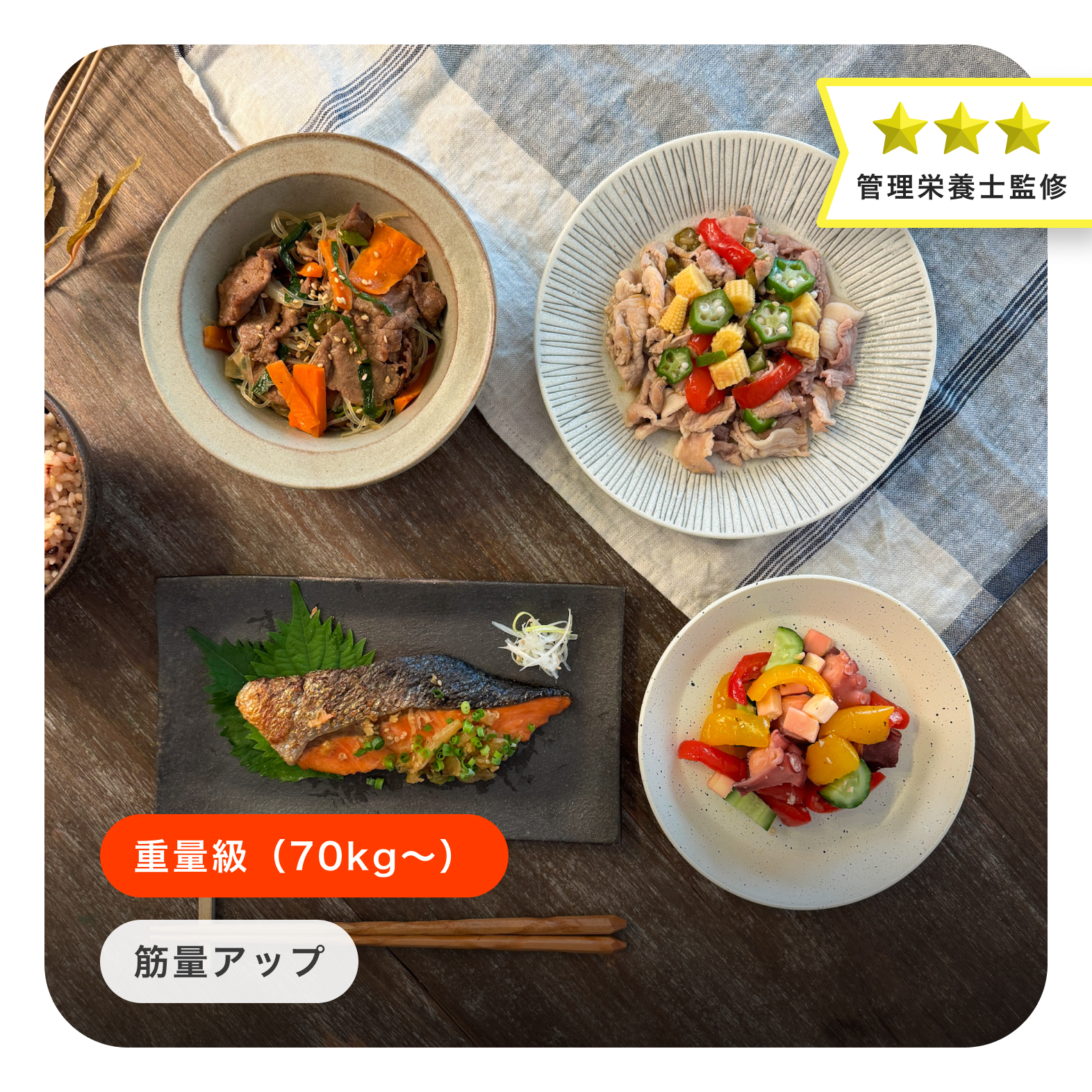 筋肉量を大幅に増やしたい重量級アスリート向けプラン。1食でたんぱく質約60gを摂取できる。体重70kg以上のアスリートに最適です。