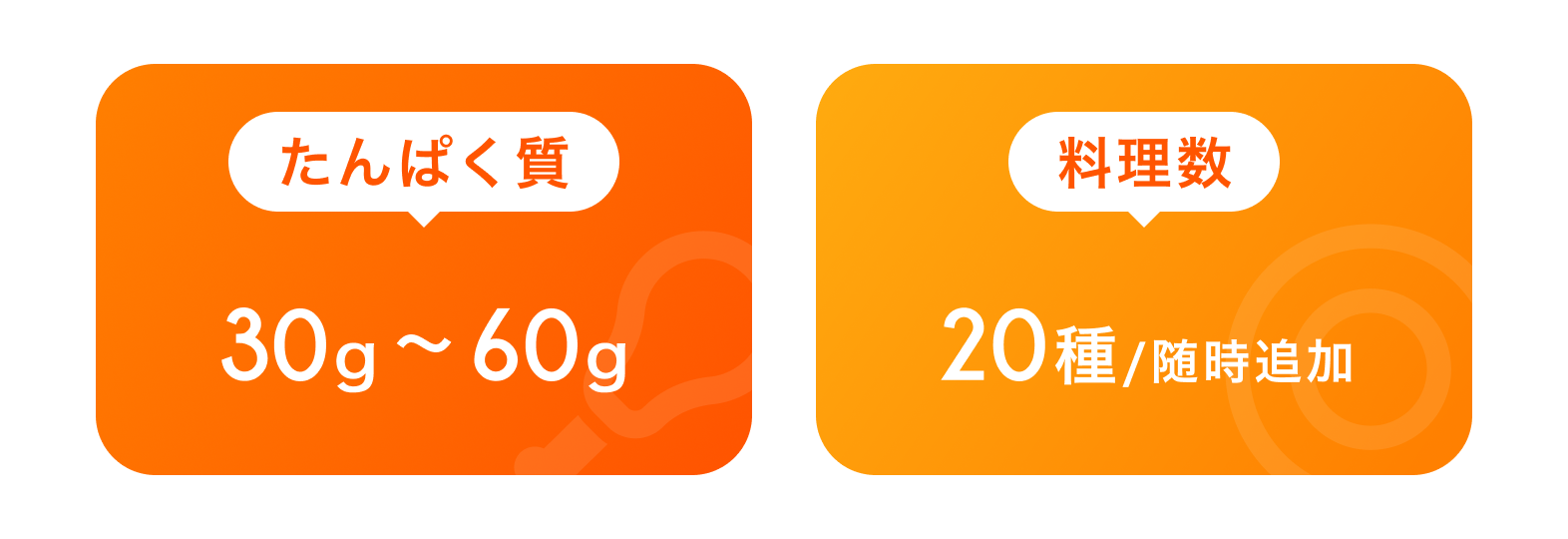 FAMのメニューは、食べる方の目的や体格に応じて栄養ボリュームコントロールが可能です。例えば、筋力アップを目指すアスリートならば、1日で体重1kgあたり2.5gのタンパク質が、一般の方ならば体重1kgあたり2.0gのタンパク質が推奨できます。「食事診断」で簡単な3つの質問に答えるだけで最適なメニューを特定し、提案します。もちろん、ビタミンやミネラルなどの栄養素もバランスよく調整されていますので、安心してお召し上がりいただけます。