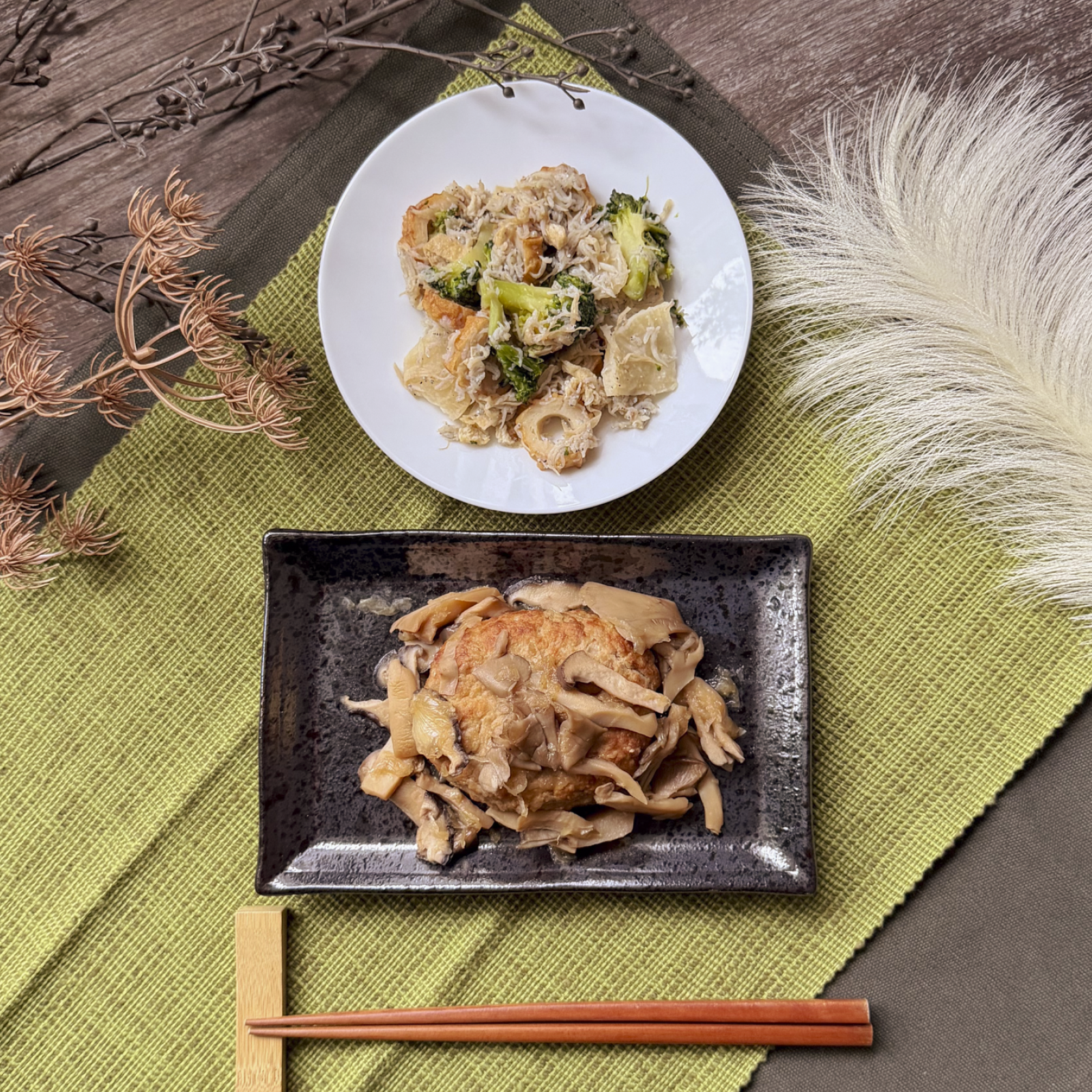 和風きのこハンバーグに、ブロッコリーと大根のしらすおかかを組み合わせた、ボリューム感がありながら、和の味わいで食べやすいプレートです。