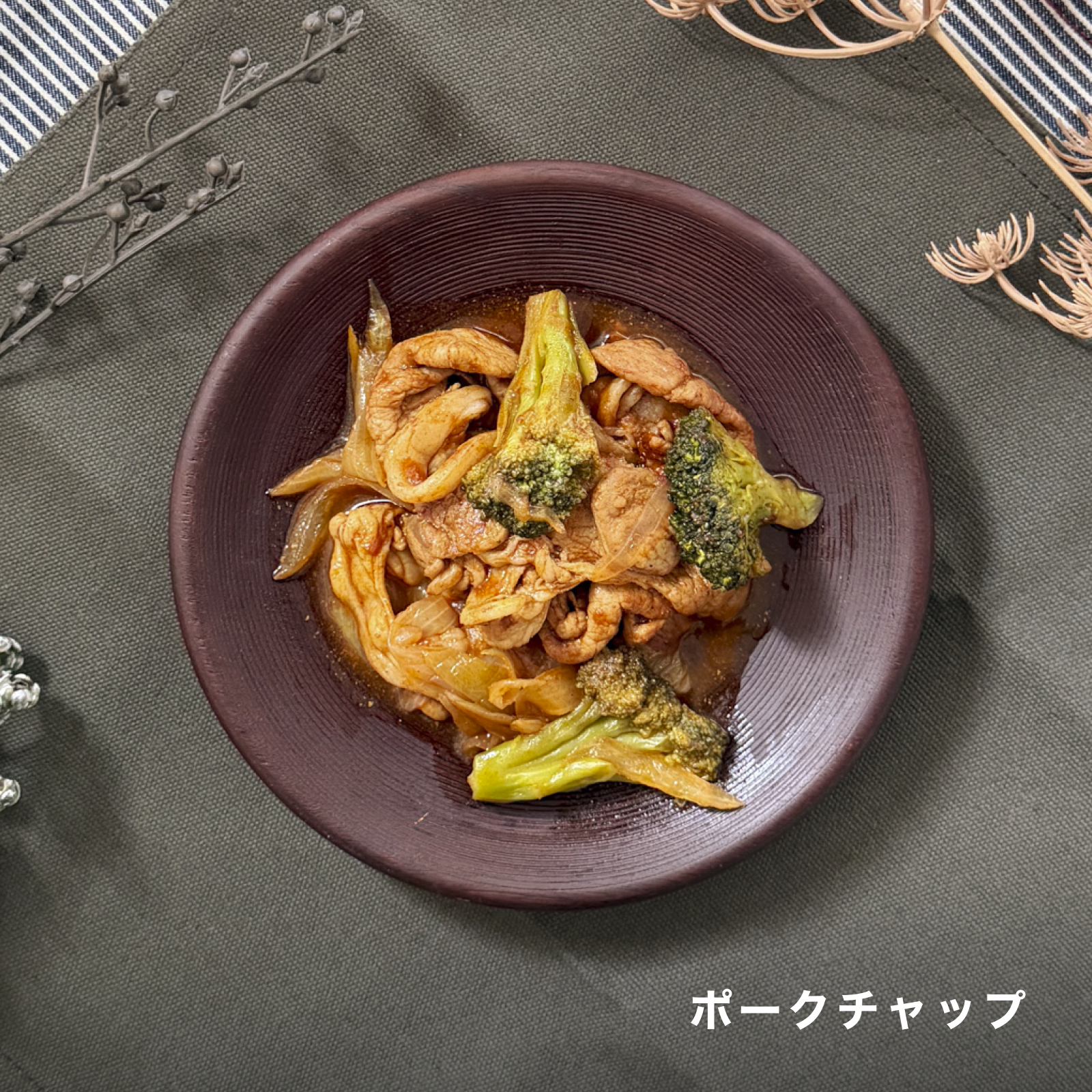 ポークチャップ:カロリー219kcal、たんぱく質24.6g、脂質5.8g、炭水化物19.3g、食塩相当量3.1g