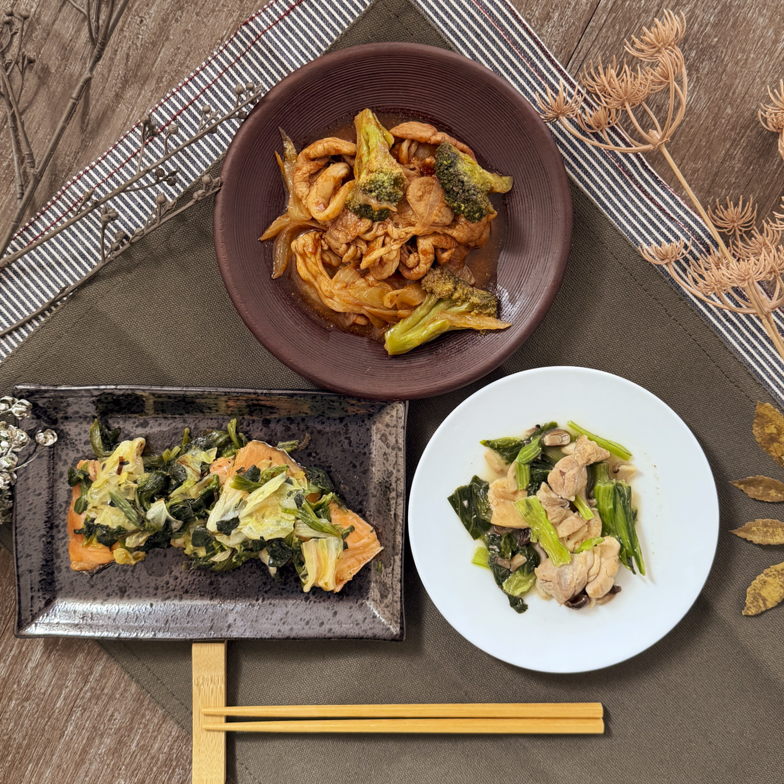 【鮭とキャベツの塩昆布焼き】銀鮭(チリ産)、キャベツ、ほうれん草、塩昆布、有塩バター/酸化防止剤(ビタミンC、茶抽出物)、調味料(アミノ酸等)、甘味料(甘草、ソルビトール)、増粘多糖類(一部に小麦、大豆、乳成分、さけを含む)【ポークチャップ】豚もも肉(ブラジル産)、玉ねぎ、ブロッコリー、中濃ソース、トマトケチャップ、調味酢、料理酒、鶏ガラ顆粒、オリーブオイル、米こうじ/調味料(アミノ酸)、pH調整剤、増粘剤(加工でんぷん)、カラメル色素、酒精、酸味料(一部に豚肉、りんご、鶏肉を含む)【チキンガーリック】鶏もも肉(ブラジル産)、小松菜、しめじ、にんにく、オイスターソース、鶏ガラ顆粒、ごま油/調味料(アミノ酸)、pH調整剤、増粘剤(加工でんぷん)、カラメル色素、(一部に小麦、鶏肉、ごまを含む)